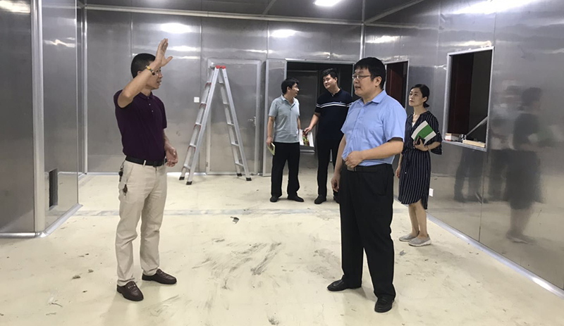 闫浩一行在李学涛陪同下实地查看了企业10万级无菌车间(GMP)和万级净化实验室,了解了中国药典标准下的生产用纯化水设备以及15KW变频螺杆空气压缩冷干设备等基础配套情况。每到一处,科技创新局的同志们看的仔细,问的详细,李学涛逐一进行了现场解答。