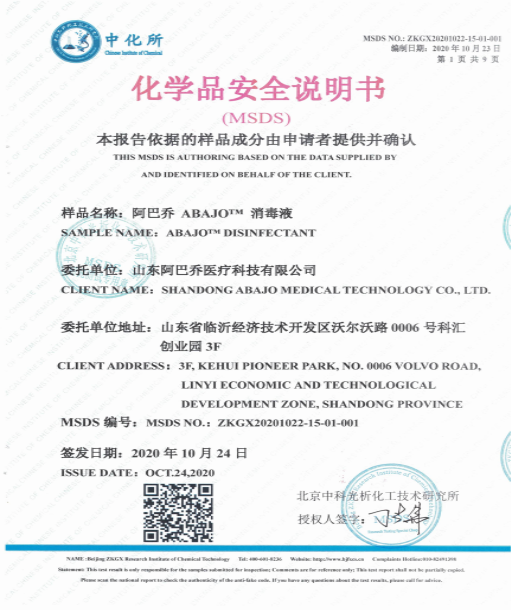 10月24日,北京中科光析化工技术研究所根据山东阿巴乔医疗科技有限公司委托,通过技术检测,科学编制出“阿巴乔ABAJOTM消毒液”《化学品安全说明书(MSDS)》。