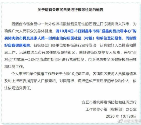 10月30日,山东省安丘市政府新闻办发布消息称,烟台冷链食品中一批外包装核酸检测呈阳性的巴西进口冻猪肉流入安丘市。安丘官方要求10月4日至10月6日到鑫牛市场“盛鑫肉品批零中心”购买过猪肉的市民主动向所属社区和单位登记报备。当地采取“点对点”方式统一组织相关市民到市政府招待所进行核酸检测。