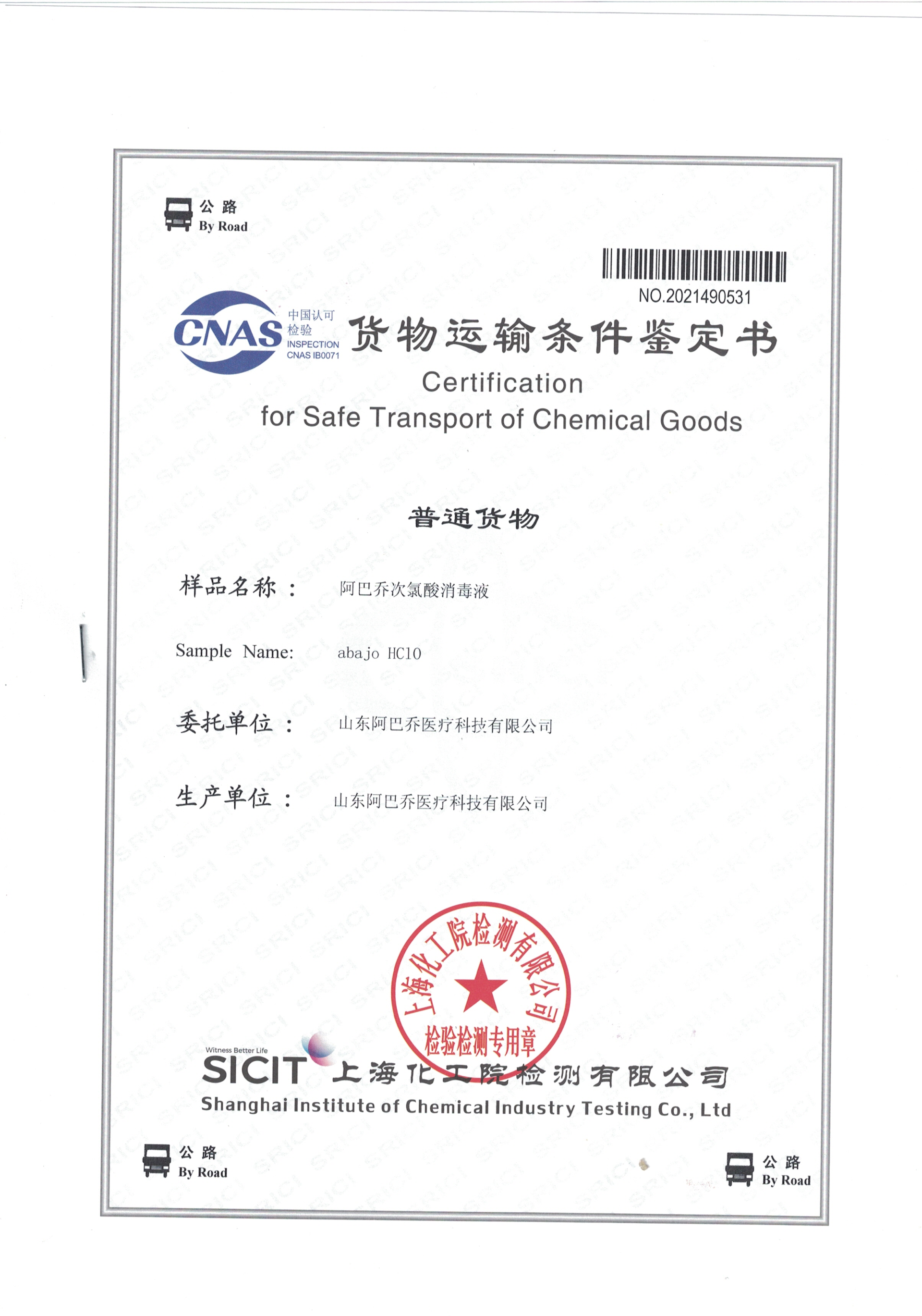 责任企业,责任担当。近日,山东阿巴乔医疗科技有限公司研发生产的“阿巴乔次氯酸消毒液”经上海化工院检测有限公司鉴定,出具了科学的货物运输条件鉴定书,确保了阿巴乔次氯酸消毒液在运输过程中的安全,可有效管控运输过程中的危险性。为了生产长效“绿色消毒”产品,阿巴乔掀起 “绿色消毒”技术革命。