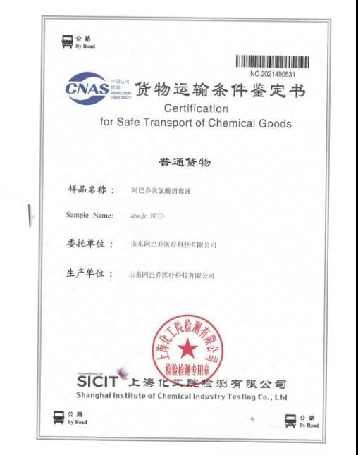 ▲ 我们研发生产的“阿巴乔次氯酸消毒液”经上海化工院检测有限公司鉴定,出具了科学的货物运输条件鉴定书,确保了阿巴乔次氯酸消毒液在运输过程中的安全,可有效管控运输过程中的危险性。