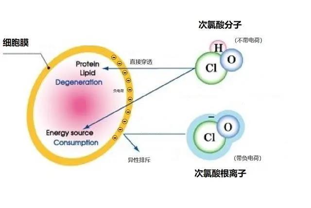 次氯酸灭活病毒能力强,次氯酸分子可以穿透细胞膜,进入细胞内部,并与其内部的DNA和线粒体发生氧化作用,让病毒细胞死亡。