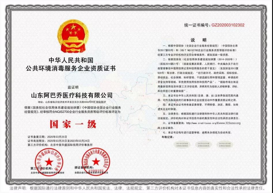 山东阿巴乔医疗科技有限公司,中国食品药品企业质量安全促进会理事单位、中国食品药品企业质量安全促进会消毒专业委员会会员单位、世卫团结基金·中国行动”全球抗疫合作伙伴,集医用防护用品、医用卫生材料、消毒(器械)灭菌功能产品、生命信 息与支持于一体的综合医疗产品服务商,可为临床和日常健康防护需要 提供安全、高效、易用的“一站式”医防卫材和高水平消毒整体解决方案。
