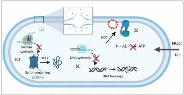 次氯酸由于分子比较小,很容易扩散到细菌表面,穿透细胞壁细胞膜,使细菌体内的酶类因氧化而失去活性;同时,次氯酸分解产生新生态氧[O],极具氧化性,可以破坏蛋白质的结构,导致机体DNA复制失败,不能进行繁殖,机体丧失功能,最终失去感染能力。